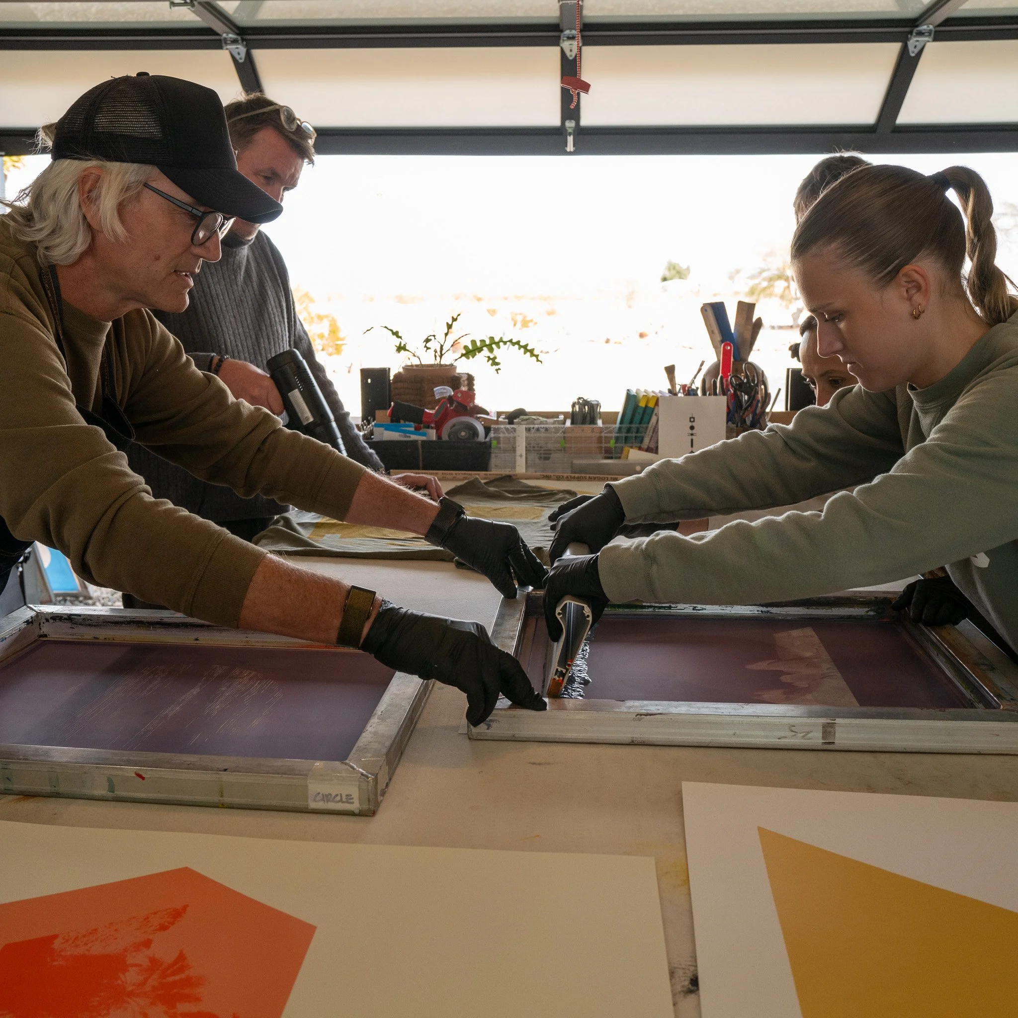 • Learn the art of screen printing in our studio, nestled in the California high desert, just outside Joshua Tree National Park. Our hands-on workshops offer an intimate setting to explore, create, and design your own unique prints.